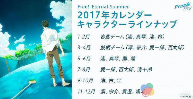 电视动画《Free!-Eternal Summer-》是以第2届京都动画大赏轻小说部门的优秀作品《High☆Speed!》为蓝本,进行改编的电视动画,亦是系列电视动画《Free!》的第2季。最近官方公开了该动画的2017年日历部分插图,俊男帅哥都在其中,粉丝们有没有特别激动呢?