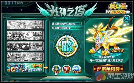 4.光神守护塔,分别挑战超水、超电、超暗黑、超光、超圣灵系的亚比,挑战每层时有一定的回合随机进入异常状态,解除该限制需要花费28星币;