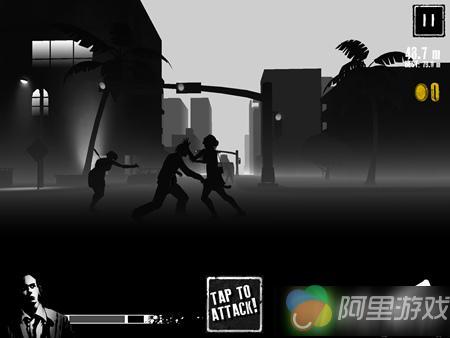 玄机就藏在它看似“横板”的画面表现方式之中。虽然主人公默认是从左到右自动奔跑,但整个场景是基于3D的,远景中的任何敌人,都有可能给主人公的安全带来威胁。而且位于Z轴上的敌人的移动速度毫无“科学性”可言,一个还在远景里面晃悠的丧尸,只要几步路就能从侧面对主角来个熊抱……主角那条长到完全不合理的HP,在这样的游戏机制下更具欺骗性。每次贴身肉搏都会消耗一部分,只有开枪先把它们撂翻在地才算安全,但如果被两只或两只以上数量的丧尸多面夹击就非常危险了,恐怕接下来就是你肠子被扯出来的特写镜头……