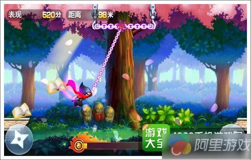 游戏的操作同样采用横版跑酷类型的经典按键方式,在屏幕左右下角各有一个按钮,右边控制角色跳跃,而左边并非传统的翻滚按钮,而是“锁链”按钮,玩家们在遇到一些距离较远的断层时候,会看到屏幕上方有拉锁,只要按住左下角的按钮就能扔出锁链勾住拉锁,忍者就能像荡秋千一样荡过去了。本作在操作上并没有采用传统的跳跃和翻滚方式,而是加入了全新的“锁链”飘荡方法,这让小编一度想起了《蜘蛛侠》和《蝙蝠侠》,他们都有这种技能,看起来十分酷。