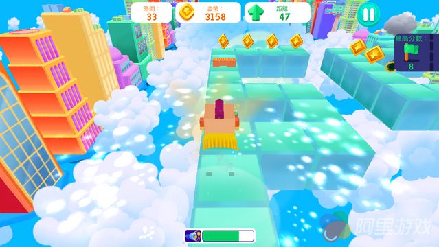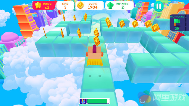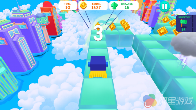 游戏的玩法比较简单,但如果哪个玩家认为简单就等于无脑的话,那么在接下来的游戏体验当中,一定会付出代价。无尽制的游戏给了玩家无限的可能,只要降低失误,玩家可以一直在浮空的道路上走下去。进入游戏,玩家将在三条路线上任意做出选择,而选定之后,角色便会自动前进,此时玩家需要做的就是根据前方的“实时路况”也就是浮动砖块的变动来选择行进的路线。当然在路途中并不会一帆风顺,各种各样的机关陷阱无时无刻不在为玩家的旅途挖坑。遇到困难想要走个回头路?哈哈已经晚了,因为随着玩家的选择,在自己身后的浮动快也会随着时间而消失,这种“开弓没有回头箭”的套路很像小编以前看过的那种综艺节目(是不是暴露了年龄)。因为悬空所以玩家从路上跌落既算作任务失败。不过值得庆幸的是,游戏会根据玩家的表现在一局游戏结束后给予玩家一定的金币奖励。