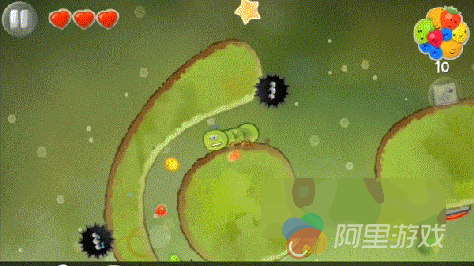 从表面上看,《毛毛虫历险记》可能很难看出游戏是如何体现“创造性”,这可能和它的俗套的游戏故事和中庸闯关玩法设定有关:《毛毛虫历险记》主要讲述毛毛虫(Bob)踏上拯救爱情的旅程。在化茧成蝶之前,勇敢的毛毛虫将要横跨草原,沙漠,异星球,抵达目的地黑暗星球。一路上,玩家的任务是在每个关卡中收集 100 个水果和三颗星星。