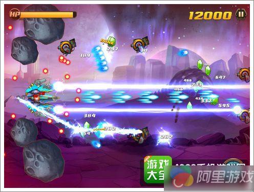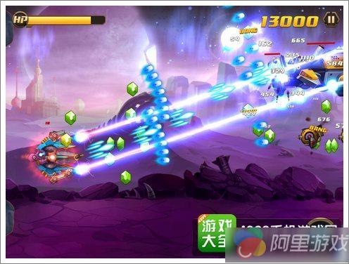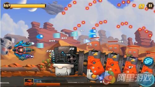 游戏画面感效果十足,操作上也给玩家们足够的激烈挑战体验,我们通过手指按住屏幕中的战舰自由滑动,即可控制战舰的位置。游戏中在屏幕的右下角还有一些功能按键,包括固定攻击按钮以及防护盾按钮,可以帮助玩家们在一定程度上聚集自己的攻击方向,向着某一个方向集中火力予以敌人强烈打击,这种可以转移角度的攻击方式在传统的飞行射击游戏中基本是没有出现过的,可以应对一些突发事件,当然也更加考验玩家们的操作能力。