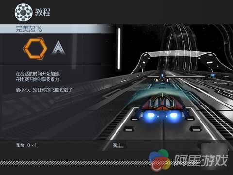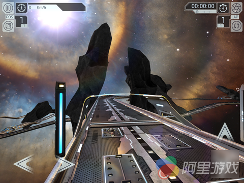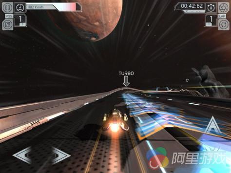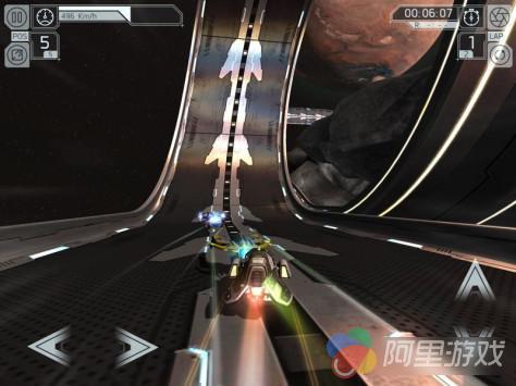 在首次进入游戏中之后玩家将会直接进入到第一个关卡中开始游戏,不过玩家不必担心,第一个关卡不会太难,主要还是为了帮助玩家熟悉游戏的玩法以及操作。游戏中采用了虚拟按键的操作方式,玩家直接点击左右方向键即可控制飞船移动,而上下键则负责飞船的加速与减速,此外当飞船飞到空中之后,玩家可以通过翻转设备的方式让飞船在空中进行翻转,翻转后飞船顺利落地即可获得一定的速度加成,此外在赛道中还有一部分区域属于加速带,当飞船经过这个区域的时候也会获得速度加成。