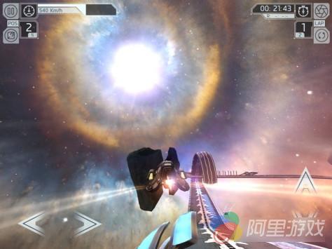 进入游戏之后首先就被游戏中精致的画面所吸引了,游戏中赛道设置在太空当中,所以周围的环境几乎都是漆黑一片的宇宙以及其中的点点星光,而游戏中的飞船细节刻画也是很细致的,而且当飞船进入高速飞行状态的时候玩家还会看到周围的环境都会变的更加模糊,而当飞船撞击到赛道周围的栏杆之后,将会迸发出激烈的火花玩家也可以清晰看到。而且游戏中采用的动感的音乐也是本作中的一大亮点,玩家可以在游戏的过程中感受到肾上腺素激增后紧张刺激的感觉。
