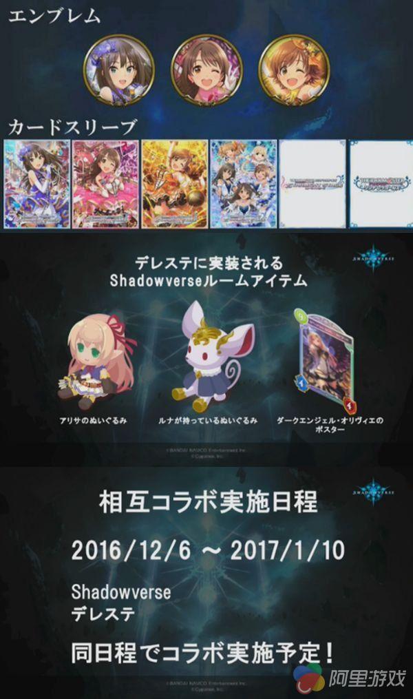 在本次活动中,来自《偶像大师》中的三位女孩岛村卯月、渋谷凛和本田未央三人将会来到《暗影诗篇》的世界中,玩家可以免费获得这三名角色的卡背。另外,《暗影诗篇》中的三张卡片“艾丽莎”、“露娜的人偶”和“黑天使奥利维亚”也会被做成家具,出现在《偶像大师之中》。