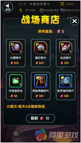 战场商店 玩家在排行榜获得名次后,会在第二天的排名结算中获得钻石、金币等丰富奖励,还会获得用于战场商店的特殊货币——魔晶。玩家可用魔晶在战场商店中购买随机刷出的稀有物品,玩家也可以使用魔晶来刷新商店出售的商品。