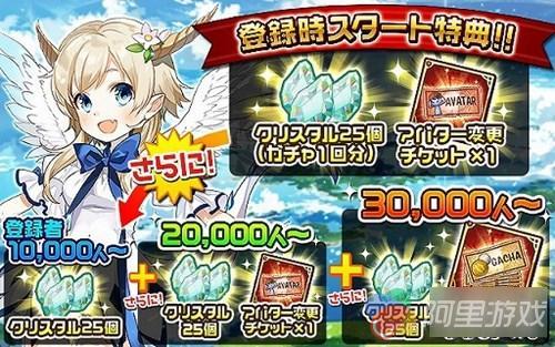 此次事前登录活动,会根据事前登录总人数追加赠送给所有玩家的游戏道具。每突破一定人数就会赠送可进行一次转蛋的水晶25个以及玩家分身变更票券等赠品。突破3万人的话,就会赠送所有玩家水晶100 个(可转蛋4 次),10 连转蛋券×1,玩家分身变更票券×2。