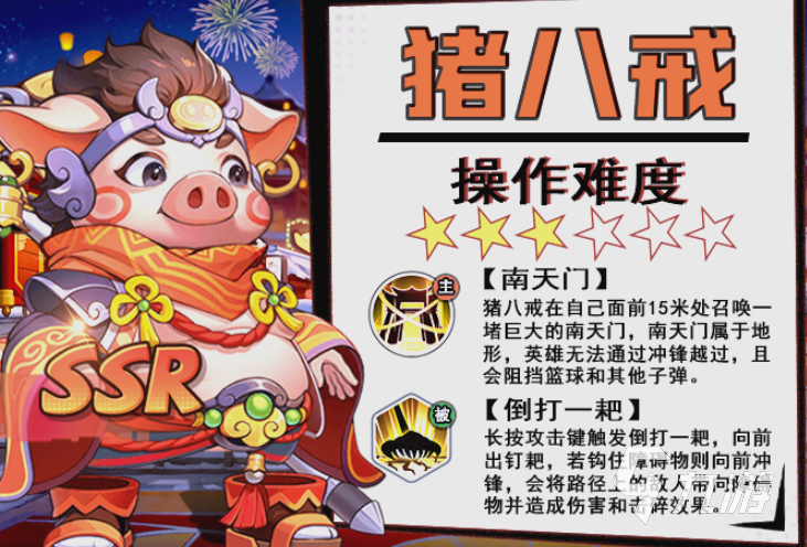猪八戒的主技能是在自己面前召唤一堵巨大的南天门,南天门属于地形,英雄无法依靠冲锋来越过,并且能阻挡住篮球和其他子弹,也就是说在比赛之中对手准备投篮时,大家就可以看准时机使用大招形成一道坚固的防线。