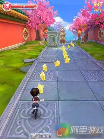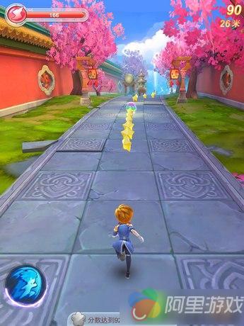 简单的故事叙述之后,游戏便开始了新手教学关卡。本作采用的是三跑道切换的跑酷玩法,玩家通过滑动屏幕即可让角色向相应方向移动。在游戏中,我们可以领略到风景各异的宫廷场景。虽然故事是建立在一个虚构的朝代,但是可以明显的感觉到是清朝的背景,所以游戏中的背景以及人物着装都充满了清朝风格。这款作品在画面的设计上很精致,不论是跑道两旁的庭院围墙,还是特色十足的人物服饰,从游戏的美术风格上便感受到了一丝特别。