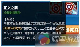 向敌方目标投掷出正义之盾对第一个目标造成180%X物理攻击的物理伤害,正义之盾会在敌方目标之间弹射,每弹射一次造成的伤害降低20%并眩晕目标1秒,最多弹射3次。