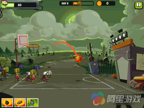 当然也并不是一定要将球投进之后砸到僵尸才能对它们造成伤害,玩家也可以直接将球弹出去撞僵尸,只不过这样就没有能量点数了,而且伤害也没有打到头部那么高,但是当你面对依稀头部有保护措施的僵尸时,比如打伞僵尸和钢盔僵尸,就必须要改变打发了。《粉碎僵尸篮球(Zombie Smash Basketball)》的难度其实还蛮高的,因为玩家不但要时刻观察僵尸群的位置,还要将球投进,而且僵尸突破到屏幕中部离开篮筐底下时,你的投篮就不能砸到它们了,这样一来僵尸们就会长驱直入,直接拆掉你的老家…