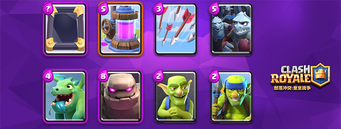 虽然戈仑石人和飞龙宝宝能够有效地镇压战场,但是这两张卡毕竟都不属于输出特别高的单位,所以我们就需要一些小生物来帮助输出了,在所有小生物红这两只移动速度极快的哥布林自然就是我们的首选,特别是近战的哥布林在安全情况下如果能够打到防御塔输出简直爆炸。