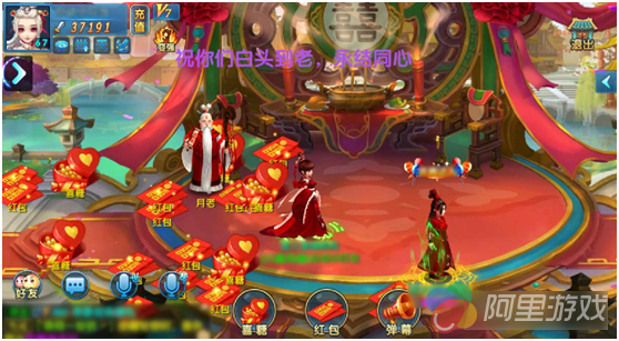 婚宴全程设有气氛值,喜糖、红包、敬酒、撒花等操作都可增加气氛值,气氛值越高,场景经验奖励就越高;宴会结束后新郎新娘会根据气氛值的高低发放对应的嘉宾礼包奖励。是不是很简单呢?相遇随缘,就在这邂逅一份情缘,《梦幻斩仙》结婚系统,祝有情人终成眷属。