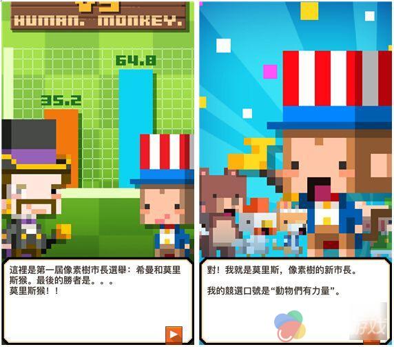 在游戏玩法同质化的今天,一个别出心裁的移动游戏命名甚至可以让它一炮而红。首先,游戏一开始就给我们上演了一场像素树市的市长竞选,希曼一看就像是个大反派,显然最终的胜出者就是莫里斯猴,这位市长的口号是:动物们有力量!不难看出,它当选了市长之后动物们才有大大的福利。
