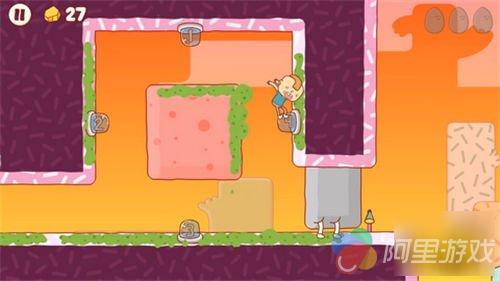 等等,看上去主角除了换了个发型以外,根本没有什么变化啊,说好的强力武器、金币磁铁、双倍速度和AOE技能呢?除了满场狂吐以外啥也不会的Gilbert,他被加强的地方也只能是自己的“专精技能”了:紫色呕吐物可以让他黏在墙壁和天花板上,让接下来的移动完全无视地心引力;黄色呕吐物类似于火箭助推器喷出的烈焰,让这位小小喷神高速飞行一段时间。至于更多颜色的呕吐物的功能,呃,先不说了,容我先去隔壁吐一会儿……