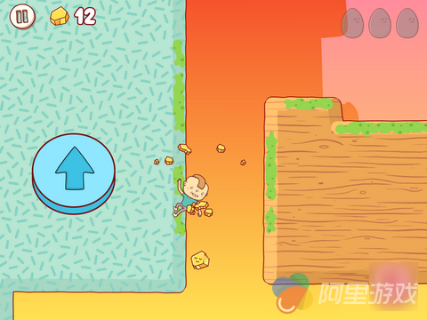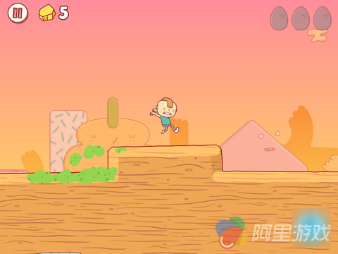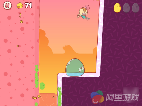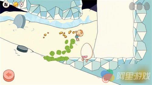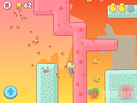 事实上,即便你玩过了所有的跑酷游戏,恐怕也会觉得《鸡蛋大冒险》的操作,尤其是角色的行动方式就同它的故事与画风一样“不可理喻”:屏幕两侧下方位置有两个用于控制方向的虚拟按键,触摸一次之后小正太就会朝着对应方向自动奔跑。中途再次按下同方向按键,你会看到开始狂吐不止的Gilbert利用这种“反作用力”从地面一跃而起。而通过一些障碍物的方式,就更加让人恶心了。比如当自己陷入一个大坑的时候,就需要反复呕吐,然后利用呕吐物所给予的“浮力”将自己重新带到与地面齐平的位置……