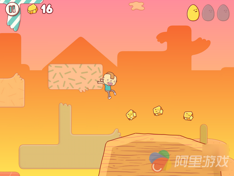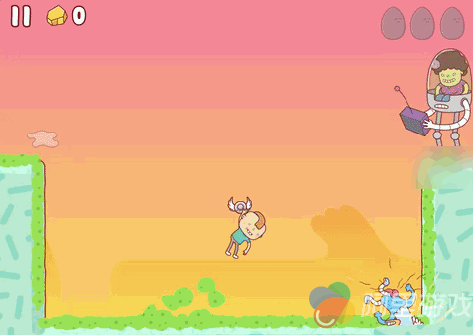 虽然这是一部跑酷游戏,但《鸡蛋大冒险》并不包含同类型作品中丰富多彩的道具和成长系统。唯一的Power-up来自于一种长着八字胡的“老头蛋”,钻进去再将其打破之后,你就能获得超能力。