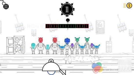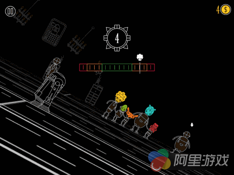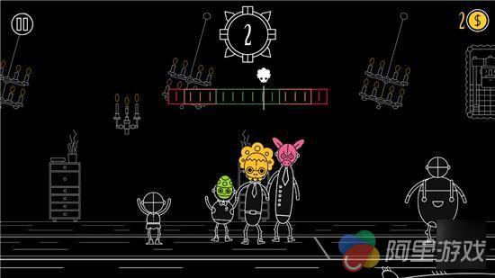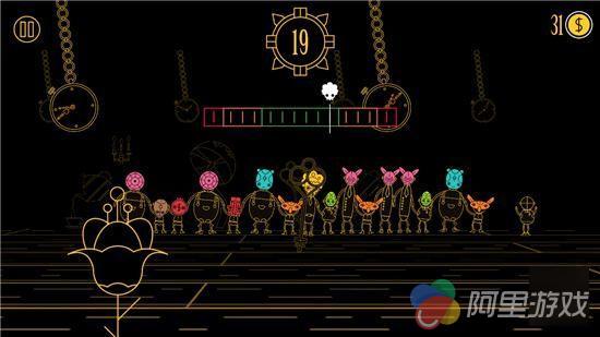 那么我们要如何拉拢小伙伴进来呢,很简单,他们会一个接一个出现在你的左右两边,一旦与你或是整个队伍接触就会融入进来,需要注意的是,从右边加入进来,那么整个队伍的重心就会往右移一些,左边同理。因此为了保持平衡让游戏不断深入,左右交替吸收舞者是最好的。然而事情并没那么简单,这里设置了一些喜欢捣乱的家伙,带有红色箭头的舞者会随机给你带来一种负面效果,比如金币减少、隐藏平衡计、颜色翻转、场地倾斜等等,这无疑会给挑战带来难度,但不得不说这也是游戏的乐趣所在。