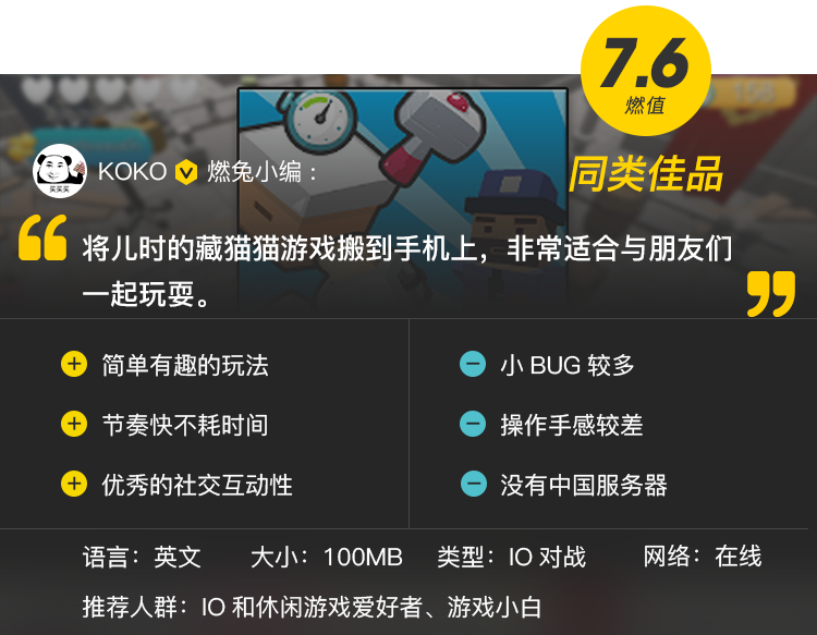 作为IO游戏,它玩法简单上手容易,几乎适合所有类型的玩家。更关键的是,它没有任何氪金、爆肝和养成的元素,每局只有五分钟,无比轻松惬意,是一款真正意义上的休闲游戏。