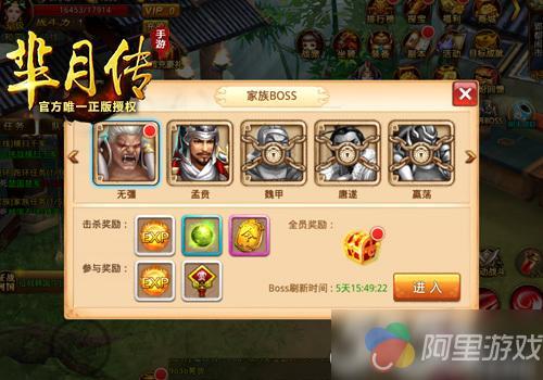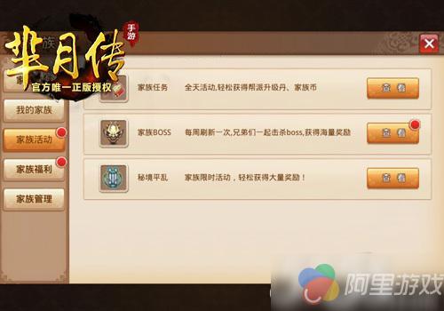 加入家族后,玩家每天完成家族任务可以获得海量奖励,参与家族BOSS、秘境平乱活动同样有大量奖励发放。家族BOSS每周刷新一次,分别为无疆、孟贲、魏甲、唐遂以及嬴荡,击杀BOSS可获海量经验、家族经验丹及家族令,此外,每天在限定时间通关秘境平乱活动也有大量铜币、贡献、元气、经验及家族令赠送。