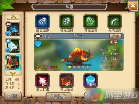 而本作并不仅仅局限于此,恐龙除了可以为玩家生产金币之外,还可以用来战斗。在战斗系统中,玩家可以将培养的恐龙组成一个最多由六只恐龙组成的战队,在游戏设置的地图中攻占关卡,通过攻占关卡玩家可以在一定时间内收获一些金币。而如何提升战队的战斗力,就需要玩家对恐龙进行培养,升级、升星、配装备,在战队的组合上需要考虑到恐龙的类型种类合理搭配,这方面的内容就逐渐开始往卡牌模式靠拢了。
