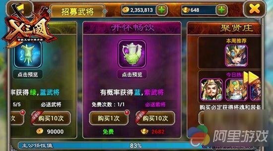 首先从基础的来讲——武将招募。《兵临三国》中武将招募主要分为酒馆招募、将魂合成、名将仰慕。酒馆招募就是在酒馆通过消耗金币、元宝、女儿红来召唤武将;将魂合成则是将收集的武将将魂合成为武将;名将仰慕通过赠送各种道具获得武将好感,当好感达到一定数值,即可召唤该武将。