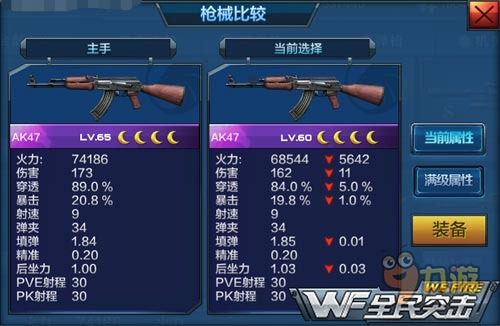 枪械提升至65后对AK47的提升也是非常大的,上图大家可以发现65级的AK47比起60级的来说火力足足高了5000多,伤害、穿透、暴击等主要属性也有所提升,并且整体火力已达到7.4之多。