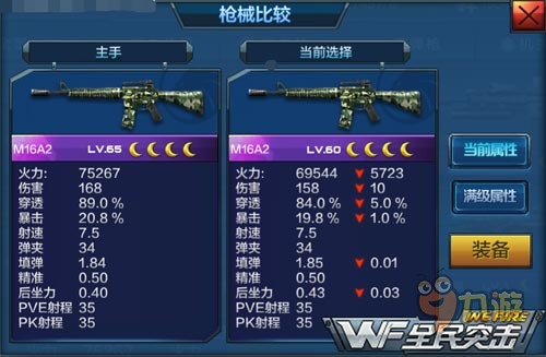 枪械等级上限提升至65级后,M16A2的各项属性都有了明显的提升,上图中大家可以发现M16A2的火力足足提升了5000多,并且伤害、穿透、暴击等主要属性都有所提升。