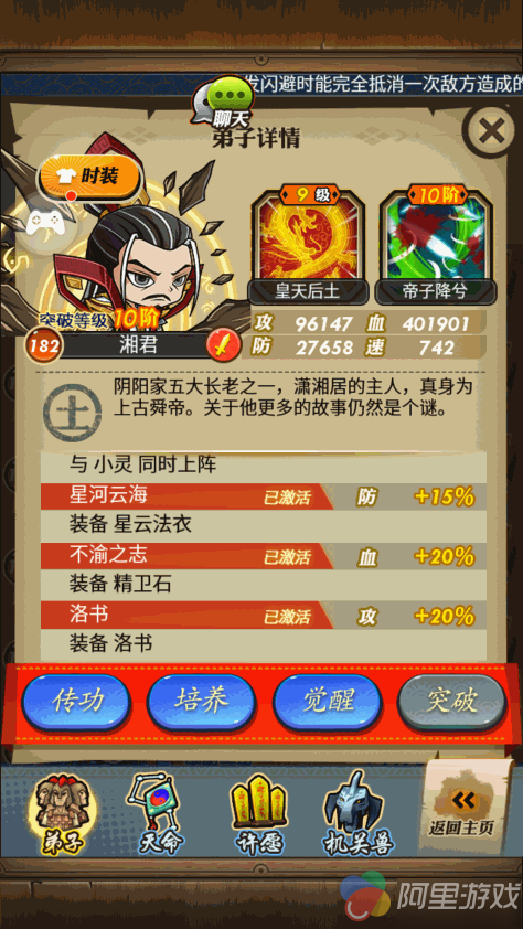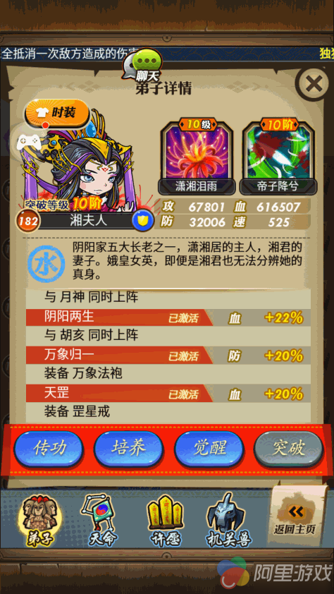 “皇天后土”触发几率(较低)对敌方后排全体进行攻击,并且对当排血量最高弟子必定暴击,“特殊效果”湘君普通攻击之后随机让敌方一名单位进入失魂状态,一回合,技能伤害也是爆表,有些不足的是触发几率,但普通攻击能有效控制敌方一个单位也是弥补了触发几率缺陷。