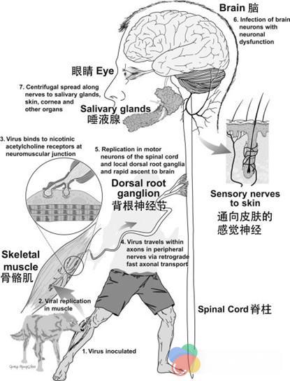 狂犬病毒,狂犬病毒是一种沿着神经以逆向传播为主的病毒。它的增殖影响了神经系统的功能,所以会产生相应的症状。