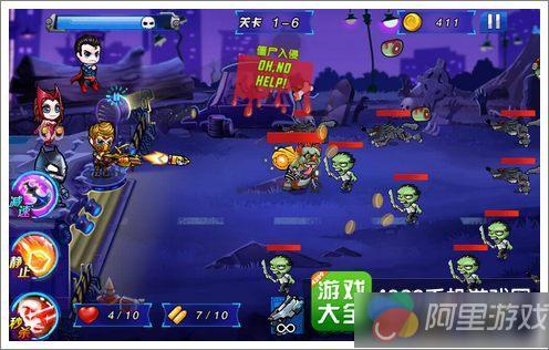 游戏中主角们无法移动,只能在左边守护基地,面对右边汹涌而来的僵尸大军,直接点击屏幕来控制射击方向。本作的操作方式也比较另类,一般而言射击游戏都是采用摇杆走位与按键攻击的方式,本作则采用了全屏点击攻击的方式,这看起来更像是塔防类型了,不过好在我们只需要控制主角就行了,其他三个超级英雄会自动攻击靠近的僵尸,这让玩家们能轻松很多。