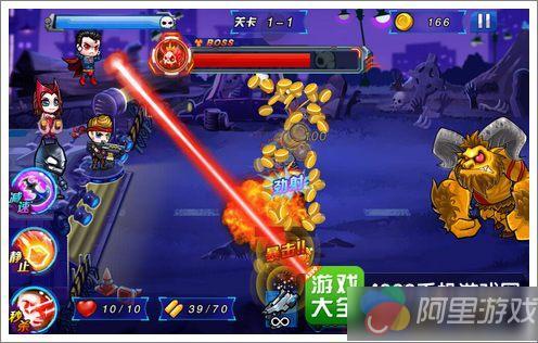 游戏的故事还是比较有吸引力的,和超级英雄们一起战斗,想想就让人激动不已,不过进入游戏之后看到的画面却让小编的心情瞬间掉到了谷底。游戏采用了横版2D画面呈现,角色全部以卡通形象制作,包括我们熟悉的超级英雄,也是比较Q版的模样,一点都不具备超级英雄该有的威风凛凛的感觉。游戏在画面上的表现并不算好,普通的卡通风格并没有任何亮点,不管是僵尸还是英雄都类似大头娃娃的模样,还好战斗过程各种激光弹幕比较璀璨一些,让战场看起来稍微激烈一点。