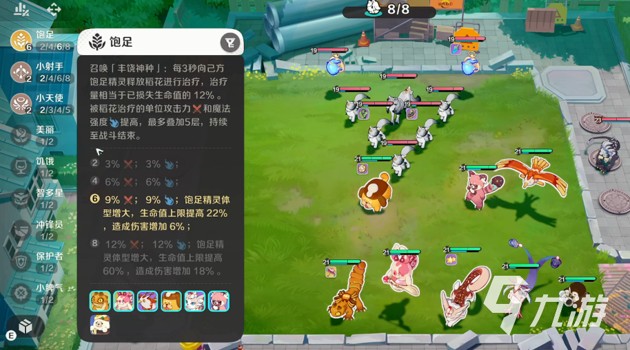 所以在8个人的情况下就是大树-ta-pa-puck-luna-敌法-小鹿-沙王。有3级精灵1级刺客1级野兽。