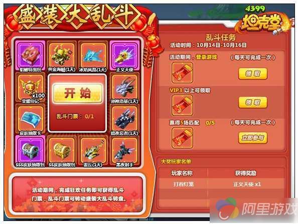 完成乱斗任务获得乱斗门票,乱斗门票可转动盛装大乱斗转盘,赢得包括貂蝉特惠包,正义天使(金木3S皮肤)等稀有奖励。