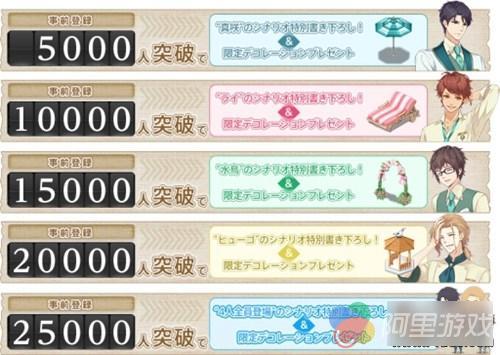 除了可以和四位工作人员建立亲密的关系之外,玩家还可以与世界各地飞来度假的精英男士展开一场美丽的邂逅!当预约人数达到5千,1万,1万5,2万,2万5时,会分别获得限定版遮阳伞,躺椅,扎花拱门、凉亭、4人配套礼物。感兴趣的玩家可以现在就登陆其网站(链接请戳这里)进行登记哦。