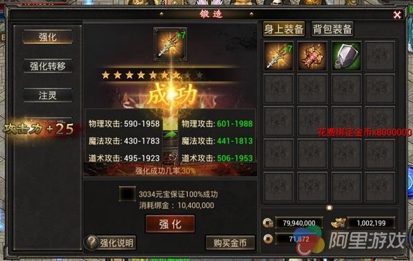 1.装备可以对其逐级强化,强化需使用绑金,每次强化有一定几率成功,也可使用元宝获得100%成功率