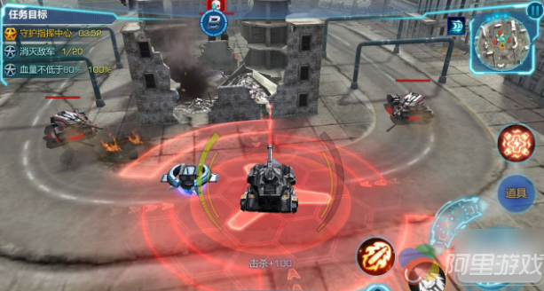 小编用的是光狐主战坦克,技能是震爆弹配合瞬时过载!基本一发震爆弹加上普通弹药就可消灭掉对方重型坦克,可节省不少时间,效率在这一关非常重要!进入关卡后,解决掉对面4辆坦克后迅速到我方指挥中心正面,期间有大概五秒的时间,可以捡个较近的BUFF!切记不要离指挥中心太远,我们的任务就是保护它。