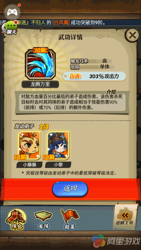 组合技“龙腾万里”,触发几率(高)攻击单体,对敌方血量百分比最低的弟子进行攻击,若击杀该弟子则让该被击杀弟子同排单位造成伤害,若单位为前排造成的伤害是该技能百分之九十的伤害,若单位为还则百分之七十,这个技能还是相当不错,PK打架很好,能有效收割残血还能打到其同排单位,但刷图能力却一般。