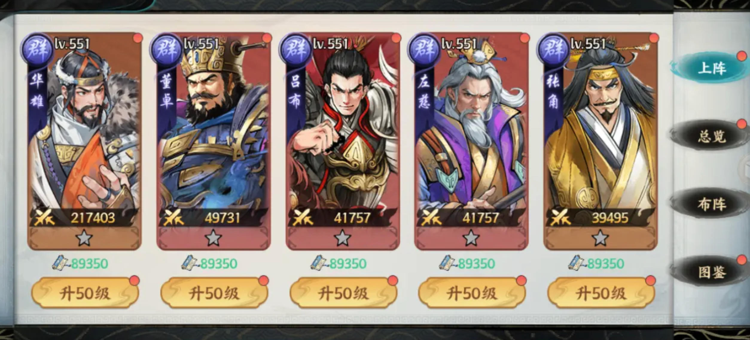 群雄阵型以麻痹效果为特点,有较强的控制、输出能力。群雄阵容里的主要将领有吕布、左慈、董卓、张角、华雄。各个将领都有自己的专长,在战斗中可以互相配合,产生强大的合力。左慈、张角、华雄可以给敌人加麻痹,使敌人的防御大幅度下降,限制敌人的行动,大大提高了群雄阵容的控制力。董卓利用麻痹效果来获得护盾增益,提高自己的坦度,在敌人持续攻击的时候能够保护好自己的阵型。
