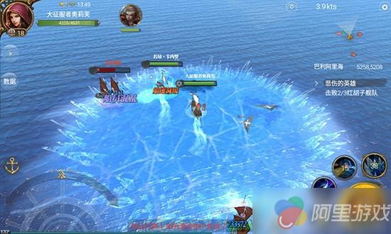 游戏中的战斗系统十分考验玩家操控技术,玩家需要通过掌握船舵(上图左下方)调整方向,使敌人在船侧的攻击范围内才能有效击打敌人。除此之外也可释放职业技能对敌人攻击。伤害同样可观。如果有玩家不适应模拟船只操纵的船舵设定的话,也可在设置中调整为常见的摇杆方式来调整方向。当然如果还是觉得麻烦不适应的话,自动战斗也是有的。
