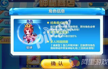 貂蝉是速度型角色,开局强力冲锋,技能冷却时间35秒,持续时间5秒。技能发动时会随机召唤男性角色清除障碍并带来神秘礼物。神秘礼物是貂蝉在多人对战中跑的更快的保证。虽然技能持续时间只有5秒,但吃到神秘礼物,还能获得更加强力的技能效果。
