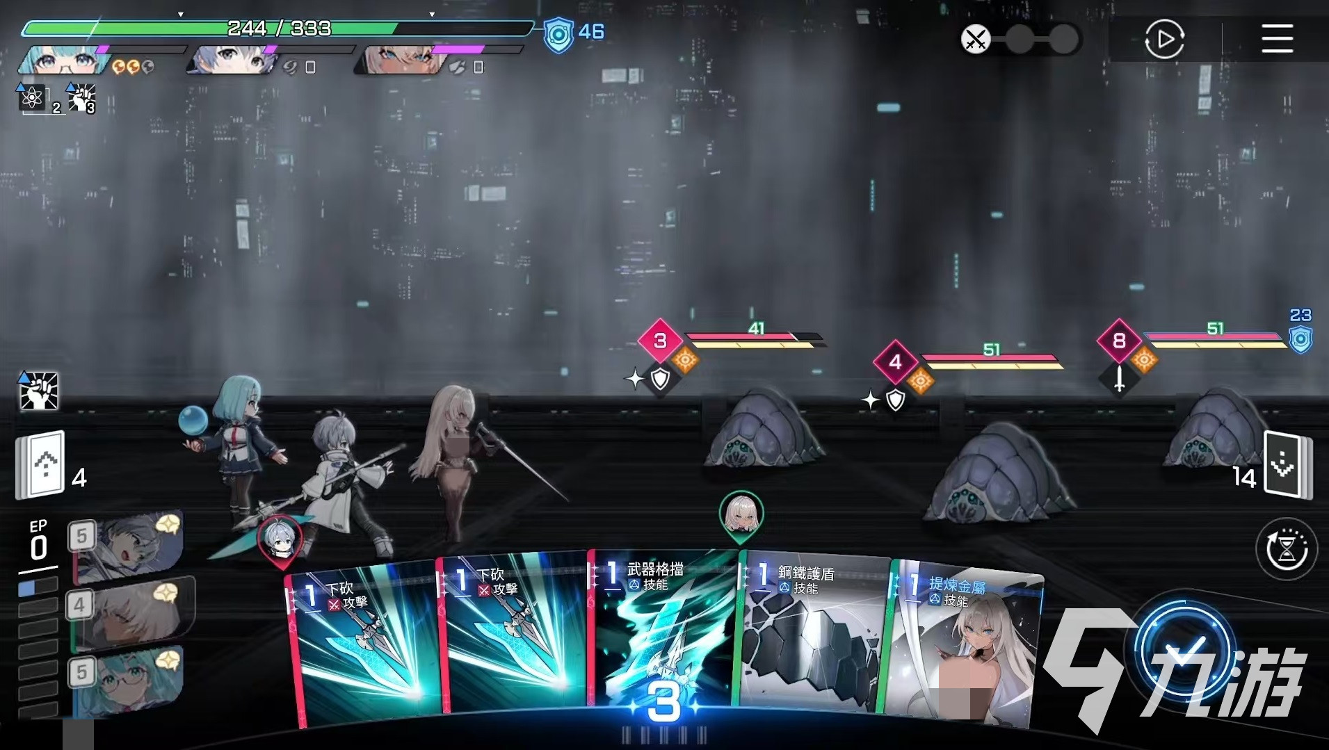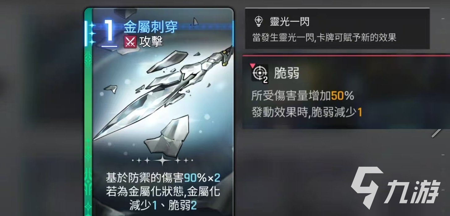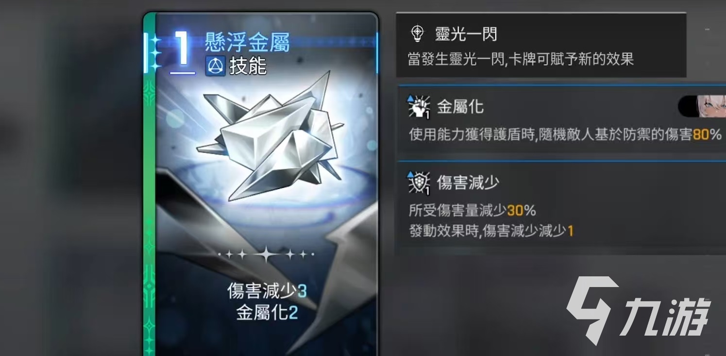 起始卡牌有四张,分别是两张一费的刺剑,属于攻击卡牌,还有一张悬浮金属和一张钢铁护盾。钢铁护盾是属于一费的技能卡,能够直接获得护盾,悬浮金属属于一费技能卡,可减少伤害,并且叠加金属化层数。独特卡牌有4张,分别是金属穿刺、提炼金属、全金属飓风攻击和铁皮。全金属飓风攻击是属于二费的攻击卡,它具有aoe效果,可对所有敌人造成高额的伤害,按照防御的属性来计算输出,并且将金属化增伤效果扩散到所有敌人。铁皮的效果是在一回合内受到的伤害量减少20%,金属化最多减少4,并按照相应的数量,减少受到的伤害量。