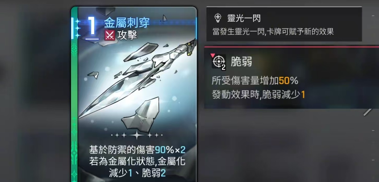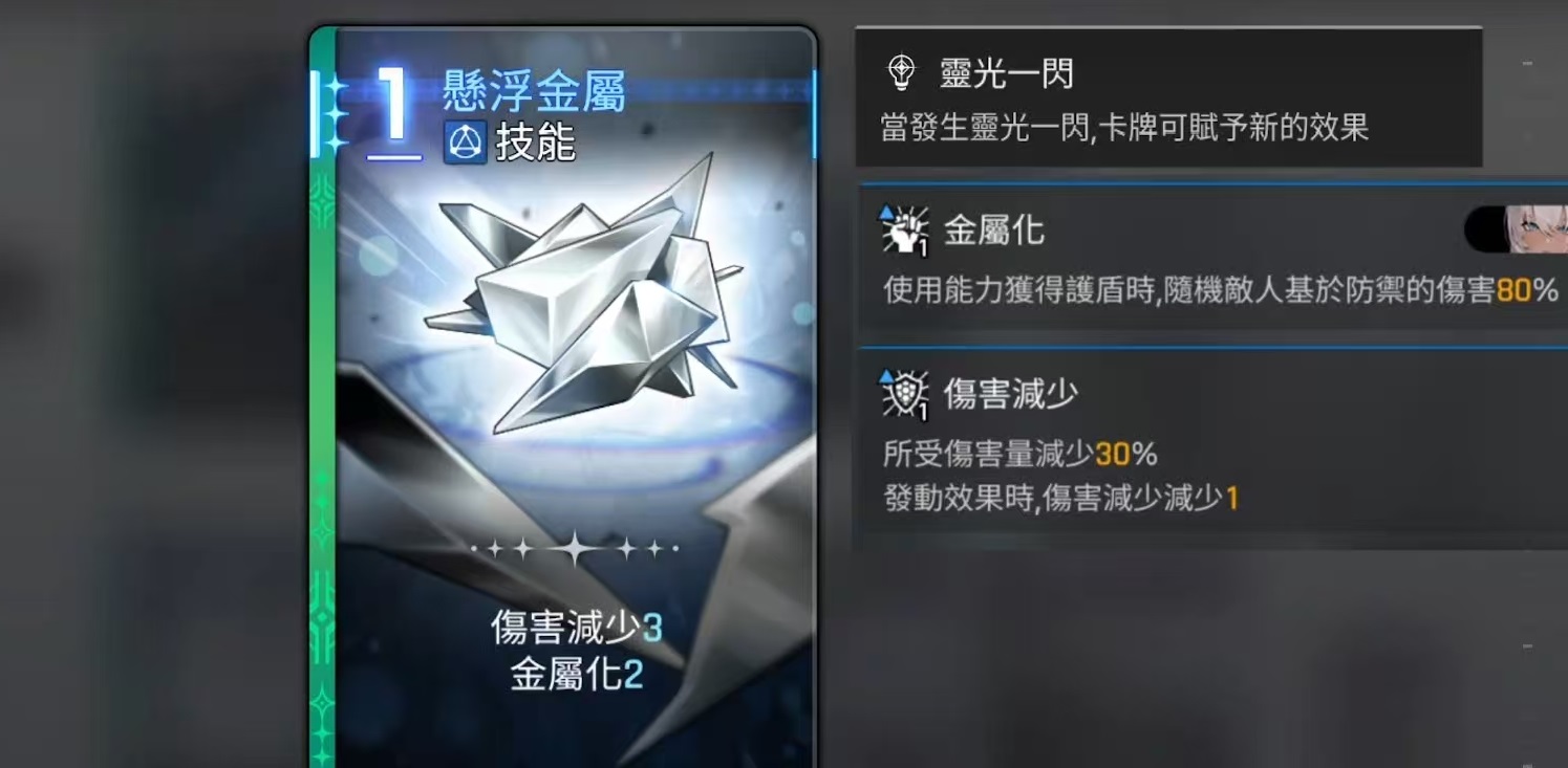 起始卡牌有四张,分别是两张一费的刺剑,属于攻击卡牌,还有一张悬浮金属和一张钢铁护盾。钢铁护盾是属于一费的技能卡,能够直接获得护盾,悬浮金属属于一费技能卡,可减少伤害,并且叠加金属化层数。独特卡牌有4张,分别是金属穿刺、提炼金属、全金属飓风攻击和铁皮。全金属飓风攻击是属于二费的攻击卡,它具有aoe效果,可对所有敌人造成高额的伤害,按照防御的属性来计算输出,并且将金属化增伤效果扩散到所有敌人。铁皮的效果是在一回合内受到的伤害量减少20%,金属化最多减少4,并按照相应的数量,减少受到的伤害量。