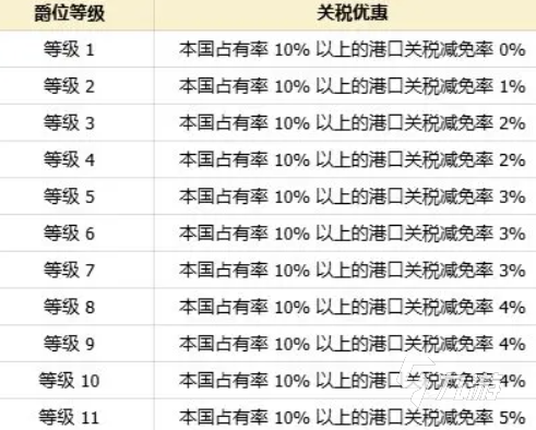 不一样爵位等级,能享受的优惠力度也不同,具体如下图所示,需要注意的是当等级到4级及以上时,提督会概率遭到NPC 的攻击,而且只有达到制定的爵位等级,才可以建造特定阶段的船只。