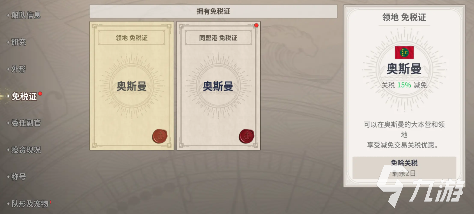 免税证是在贸易之际能享受关税减免的凭证,能帮助提督在贸易之中节省成本,大家可以在各国的王国中领取,每一张免税证的有效期是3天,领取的时候需要消耗蓝钻,由于在本国境内能享受到减免优惠,所以更加建议大家去拿其他国家的免税证,尤其是有着关键贸易品、或是常用城市所在国家的免税证,需要注意该证分为两种类型,一种是领地类可以在发放国的大本营和领地使用,另外一种是同盟港口类,可以在发放国的同盟港口使用。
