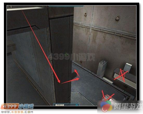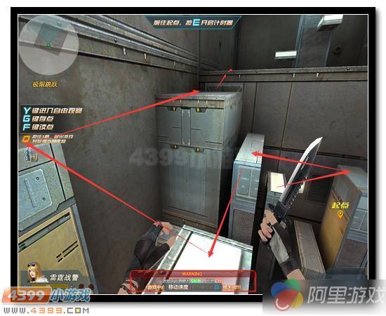 这个部分也有两个可以速跑的地方:1.第二幅图中按照左数第一个红箭头的跳法直接可以越过那个小方块跳到那个大方块上; 2.第三幅图中蓝圆圈方块可以用蹲滑步直接蹲过去,不用起跳!