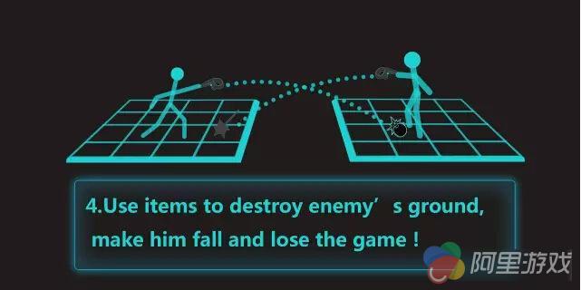 捡起地上、空中的道具扔向对方,砸坏对方脚下的生存空间,任何一方掉下高台后,游戏结束。