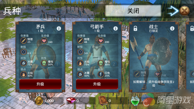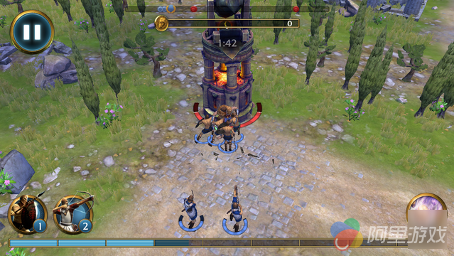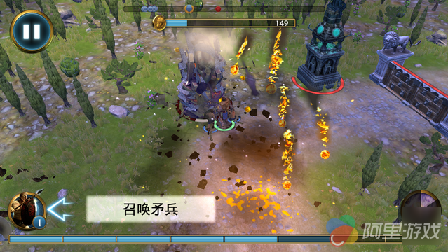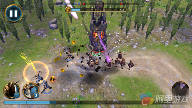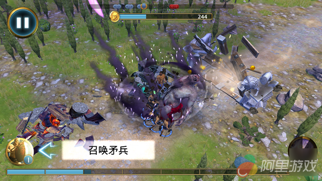 游戏的玩法主要包括了“战场”与“内政”两方面,前者就是具体的捉对厮杀,是我们扩张领土、争夺霸权的主要途径。而要想让征战毫无后顾之忧,那么对于后者的悉心钻研就是一件绝对不能马虎的事情。战场以关卡的形式展开,每一个岛屿便是一个关卡,玩家的军队由英雄和随从两部分组成,英雄有着自己的技能,点击释放可以造成巨额的伤害,而随从的种类则多种多样,涵盖了近程、远程、刺客、战士等多种职业。随从并不是开场就有的,需要玩家消耗能量召唤,能量条就是我们在游戏下端看到的长条,它会满满的增长。游戏获胜的判定也很简单,只要我们攻破了敌方的城门就可以了。通关后系统会根据玩家的表现给与评价,这些评价有助于我们解锁其他的地图。