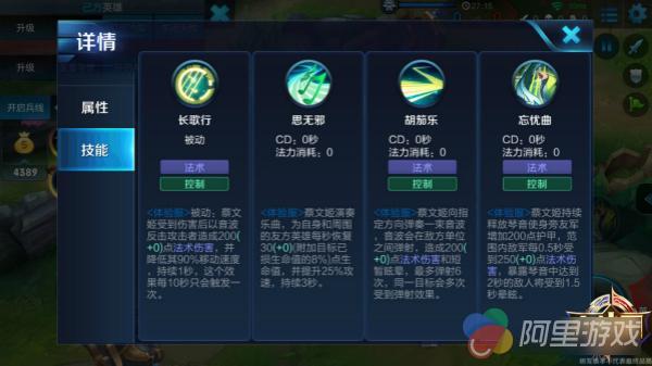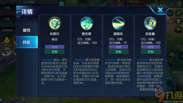 三技能——忘忧曲:蔡文姬持续释放琴音使身旁友军增加200点护甲,范围内敌军并每0.5秒受到一定法术伤害,暴露琴音中达到2秒的敌人将受到1.5秒晕眩。